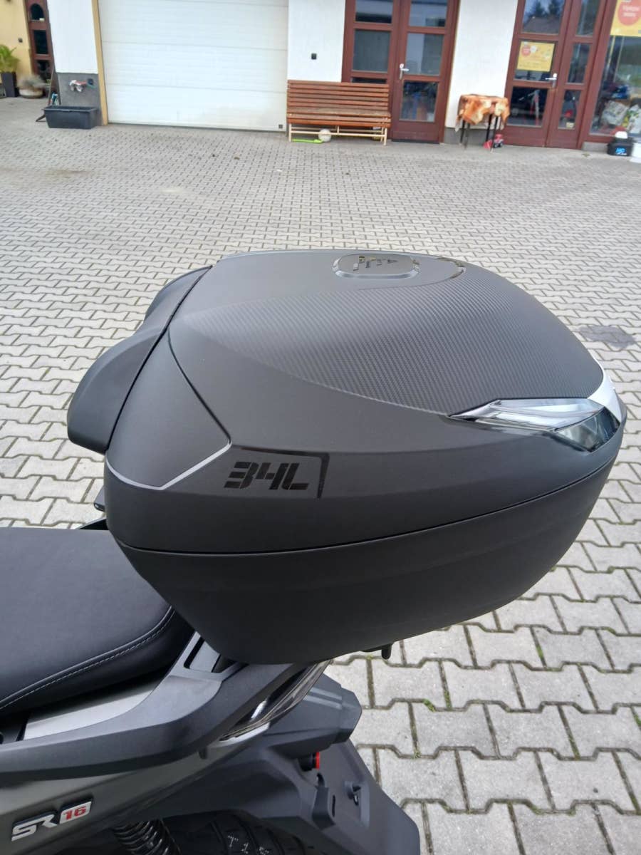 Pod sedlo hodíš běžnej nákup, případně jetku nebo menší integrálku. A kdybys vyrazil na větší nákup, už v základu dostaneš zadní hliníkovej nosič s 34litrovým kufrem. Drobnosti si schováš do uzavíratelný přihrádky s USB, kterou mám v předním štítu.